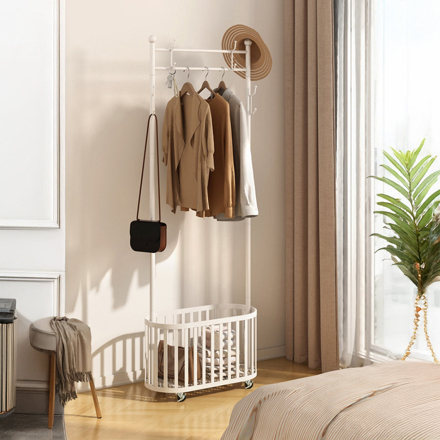 With a spacious bottom basket, you can easily store shoes, bags, or folded items, while the smooth-rolling wheels allow you to move your clothing display effortlessly from one space to another. Whether you're organizing your home, setting up a retail display, or creating a pop-up shop, the Robyn Garment Rack offers a clean, professional presentation.