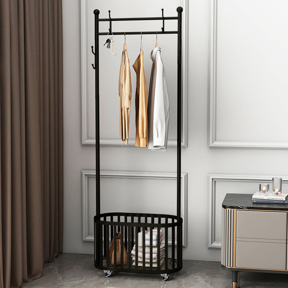 Maximize your clothing storage space with the Robyn Rolling Garment Rack with Basket — the perfect solution for organizing clothes, shoes, and accessories while maintaining a sleek, modern look. Designed with durable black metal tubing, this rolling garment rack combines style, functionality, and mobility, making it ideal for homes, boutiques, retail stores, and pop-up events.